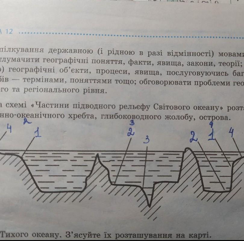 Підпішіть на схемі «Частини підводного рильєфу Світового океану» розташування улоговини, серединно-океанічного хребта, глибоководного жолобу, острова