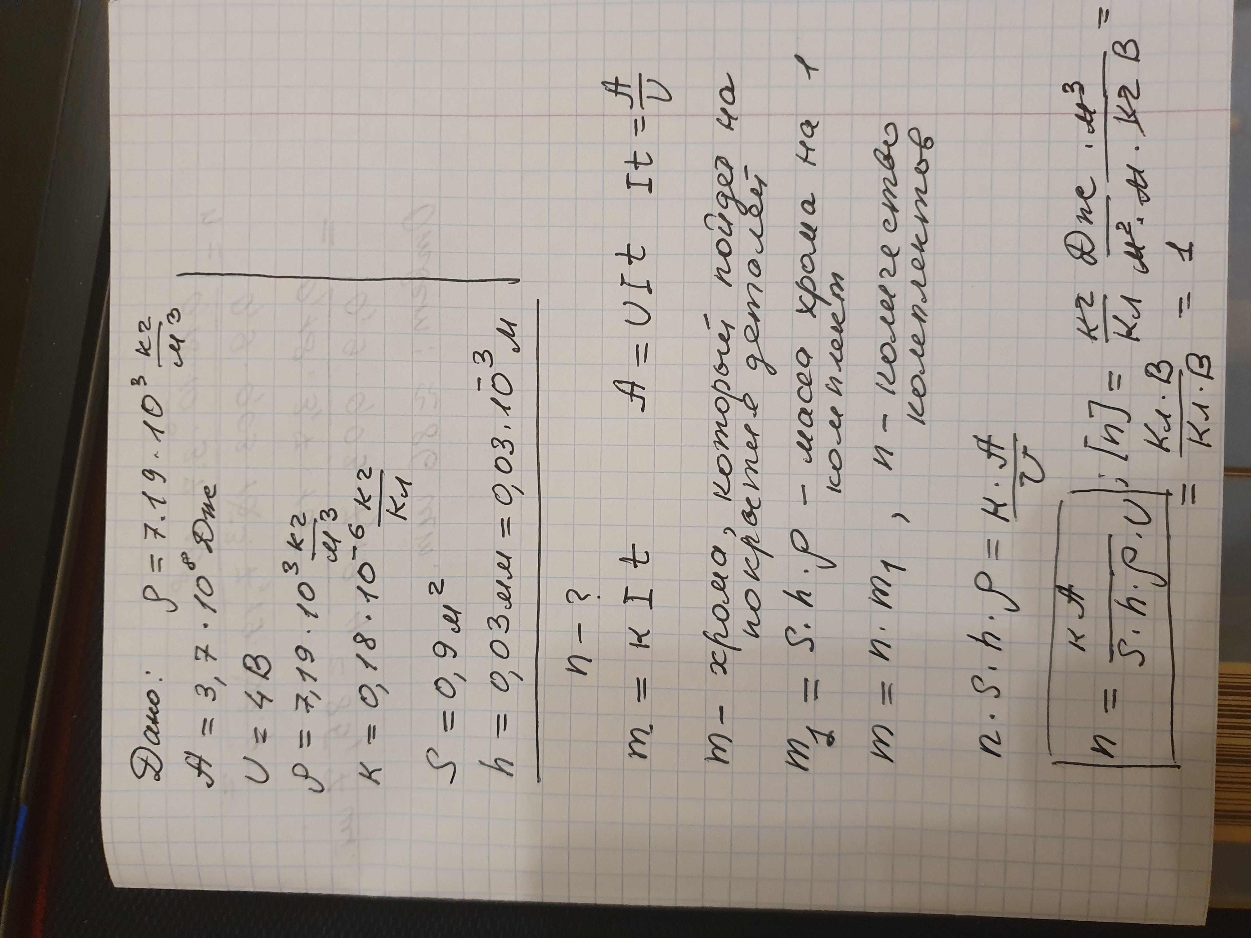 Поверхня хромованих деталей становить 0.9м² товщина покриття 0.03мм. Скільки комплектів деталей можна прохромувати при витраті електроенергії 3.7×10⁸Дж. Напруга на затискачах 4В. Густина хрому 7.19×10³кг/м³, а електрохімічний еквівалент хрому 0.18мг/Кл.