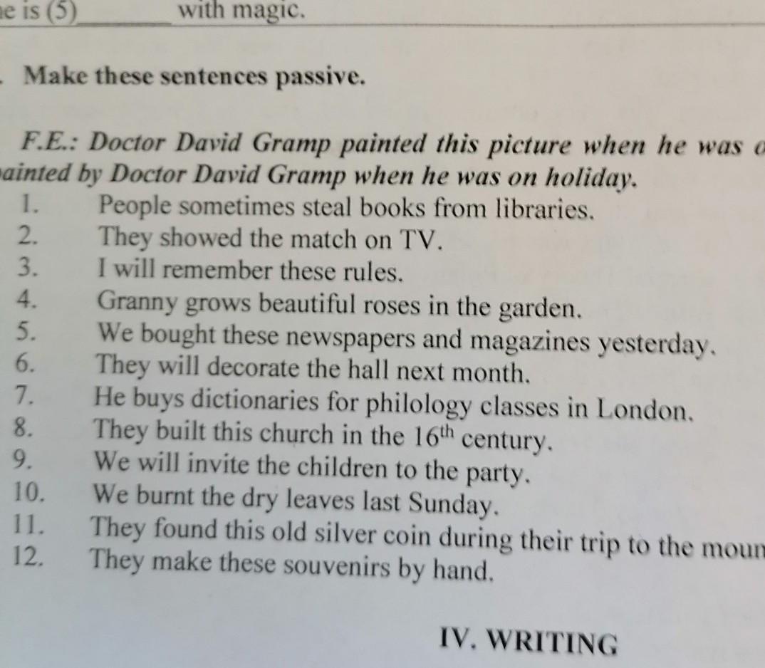 1. Books are sometimes stolen from libraries by people. 2. The match was shown on TV by them. 3. These rules will be remembered by me. 4. Beautiful roses are grown by granny in the garden. 5. These newspapers and magazines were bought by us yesterday. 6. The hall will be decorated by them next month. 7. Dictionaries for philology classes are bought by him in London. 8. This church were built by them in the 16th century. 9. The children will be invited to the party by us. 10. The dry leaves were burnt by us last Sunday. 11. This old silver coin was found by them during their trip to the moun