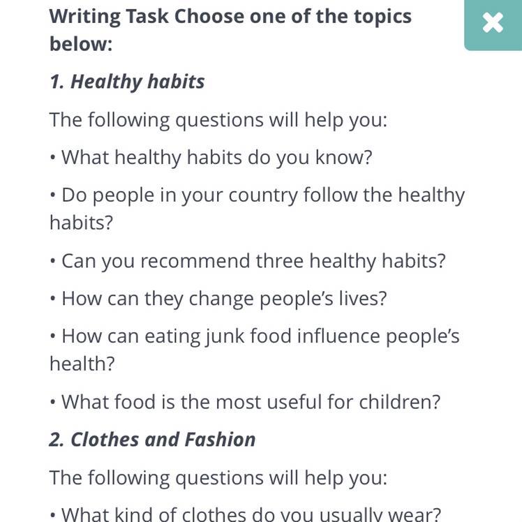 Writing Task Choose one of the topics below: 1. Healthy habits The following questions will help you: • What healthy habits do you know? Do people in your country follow the healthy habits? Can you recommend three healthy habits? • How can they change people's lives? • How can eating junk food influence people's health? • What food is the most useful for children? 2. Clothes and Fashion The following questions will help you: What kind of clothes do you usually wear? • What's your favorite piece of clothing? • Where are some good stores to buy clothes in your city? • How often do you go clothes shopping? • What is your favorite brand?