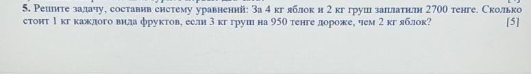 5. Решите задачу, составив систему уравнений: За 4 кг яблок и 2 кг груш заплатили 2700 тенге. Сколько