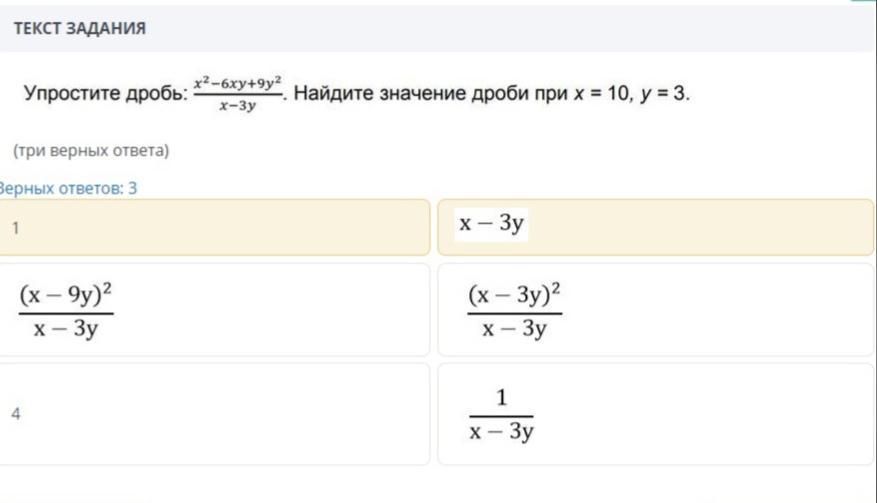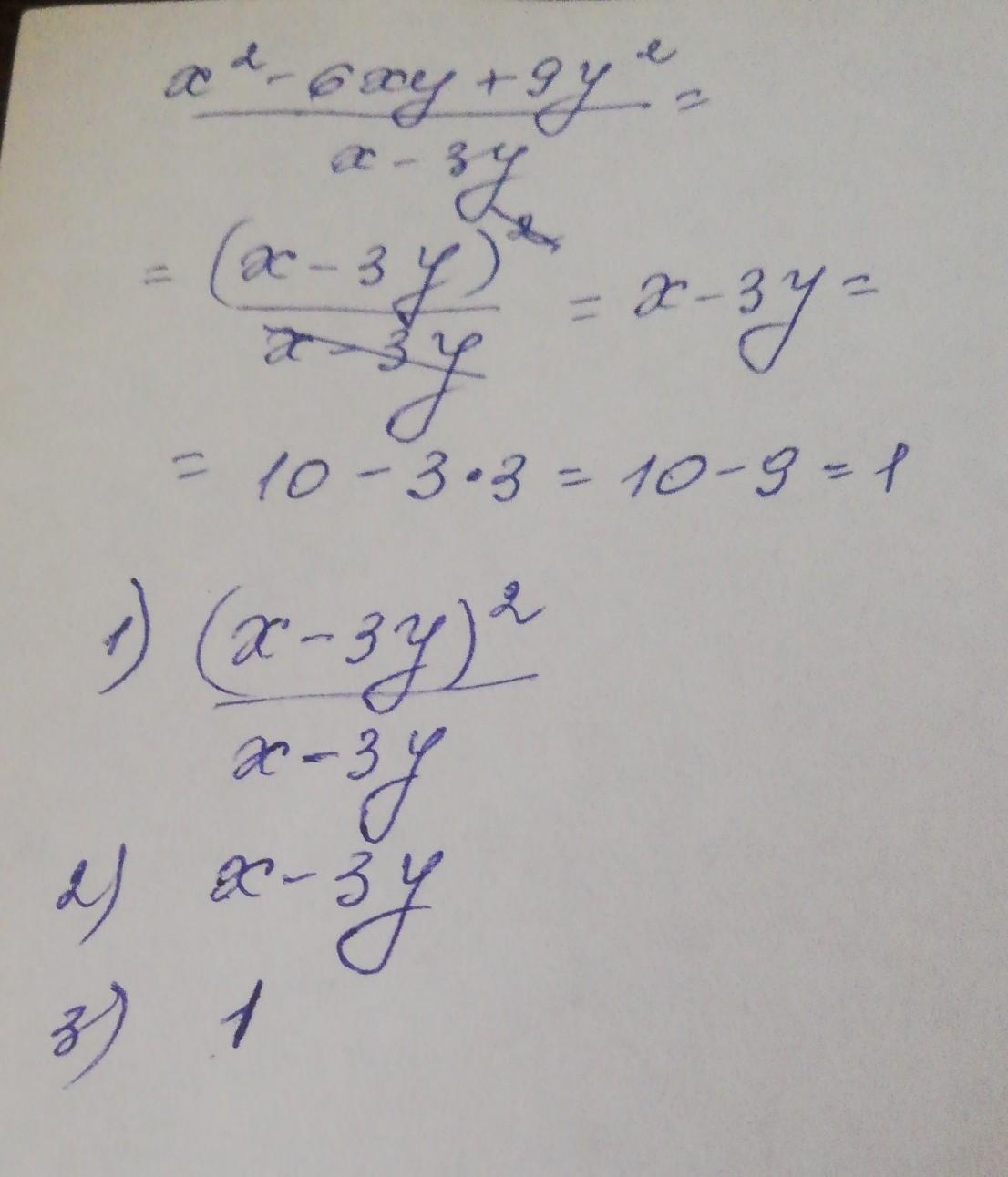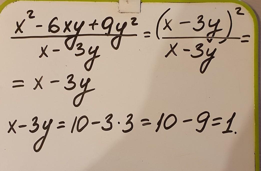 Упростите дробь: x^2-6xy+9y^2/x-3y, найдите значение дроби при x=10, y=3.