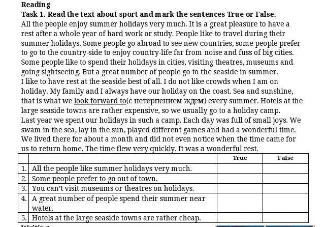 I like to have rest at the seaside best of all. I do not like crowds when I am on holiday. My family and I always have our holiday on the coast. Sea and sunshine, that is what we look forward to(с нетерпением ждем) every summer. Hotels at the large seaside towns are rather expensive, so we usually go to a holiday camp.