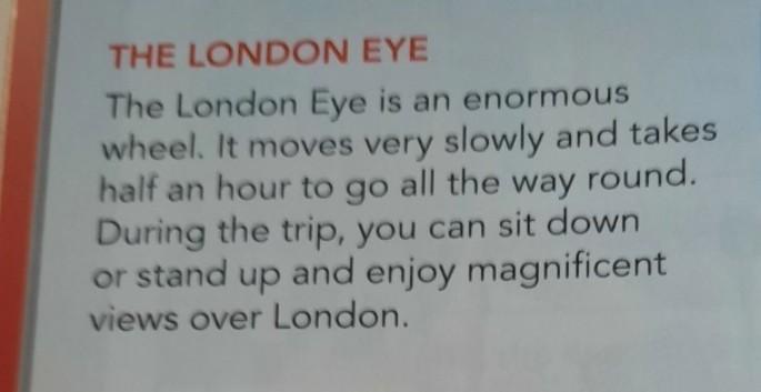 Колесо обозрения в Лондоне огромного размера.Оно двигается очень медленно чтобы сделать круг надо 30 минут весь путь ты можешь сесть или встать и наслаждаться прекрасным видом Лондона