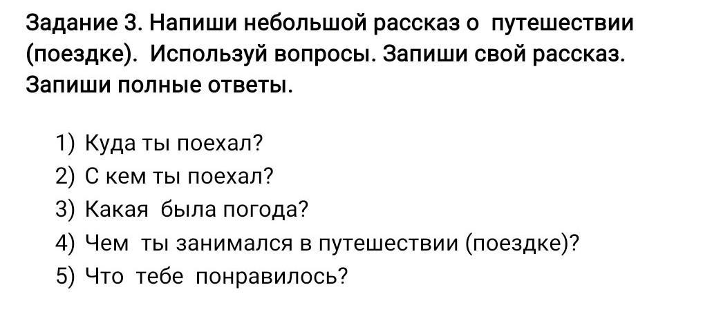 Напиши небольшой рассказ о путешествии (поездке). Используй вопросы. Запиши свой рассказ. Запиши полные ответы.