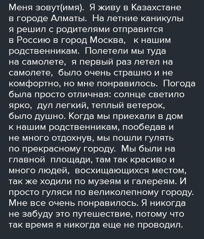 Ответ:Вся моя поездка началась с аэропорта, самолет я ждала не долго, но вот перелет был очень долгим 6 часов! Прилетев в Египет я с мамой и братом вышли из аэропорта. На улице лило как из ведра! И по этому в отель мы поехали на автобусе. В 1-ый день мы поехали на одно из самых знаменитых достопримечательностей, Пирамиды! Было очень интересно! В остальные дни мы отдыхали и в последний день мы путешествовали по городу. Но самое памятное для меня было, пойманный моим братом, мы оставили его в Египте. Это было прекрасное путешествие! С очень памятными моментами,