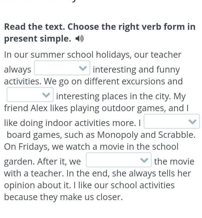 the movie with a teacher. In the end, she always tells her opinion about it. I like our school activities because they make us closer.