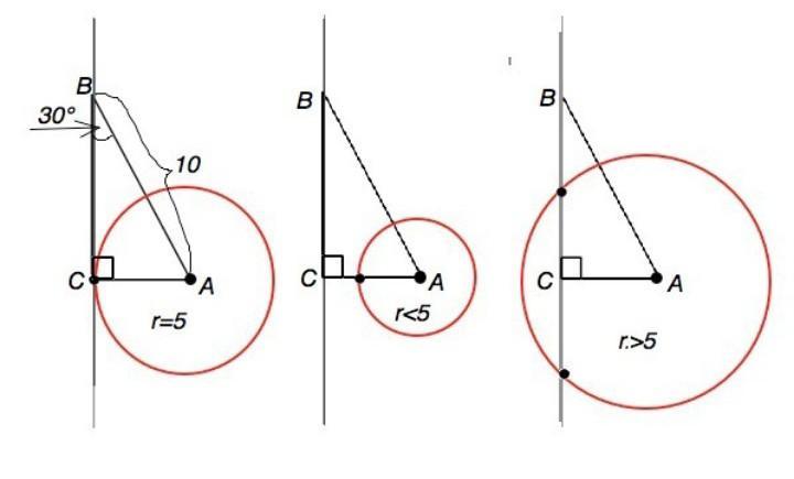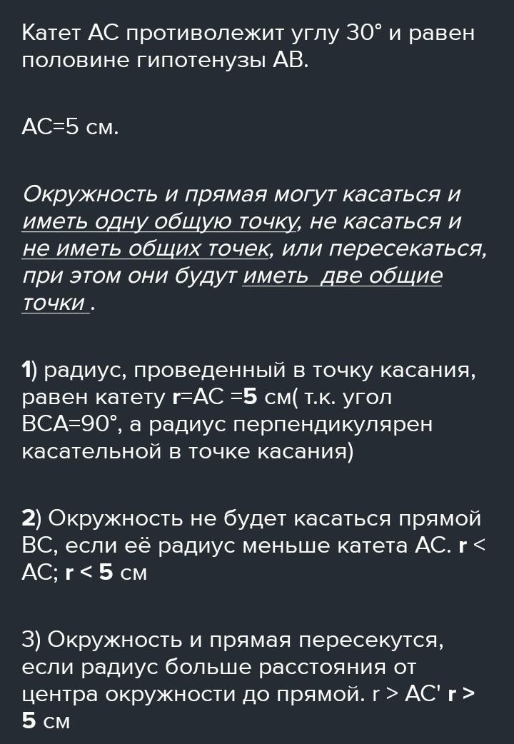 в прямоугольном треугольнике ACВ угол C равен 90 градусов AB равен 10 градусов а B C равен 30 градусов с центром в точке О проведена окружность Каким должен быть радиус чтобы;а) окружность касалась прямой ВС;b) окружность не имела общих точек с прямой ВС;с) окружность имела общие точки с прямой ВС?