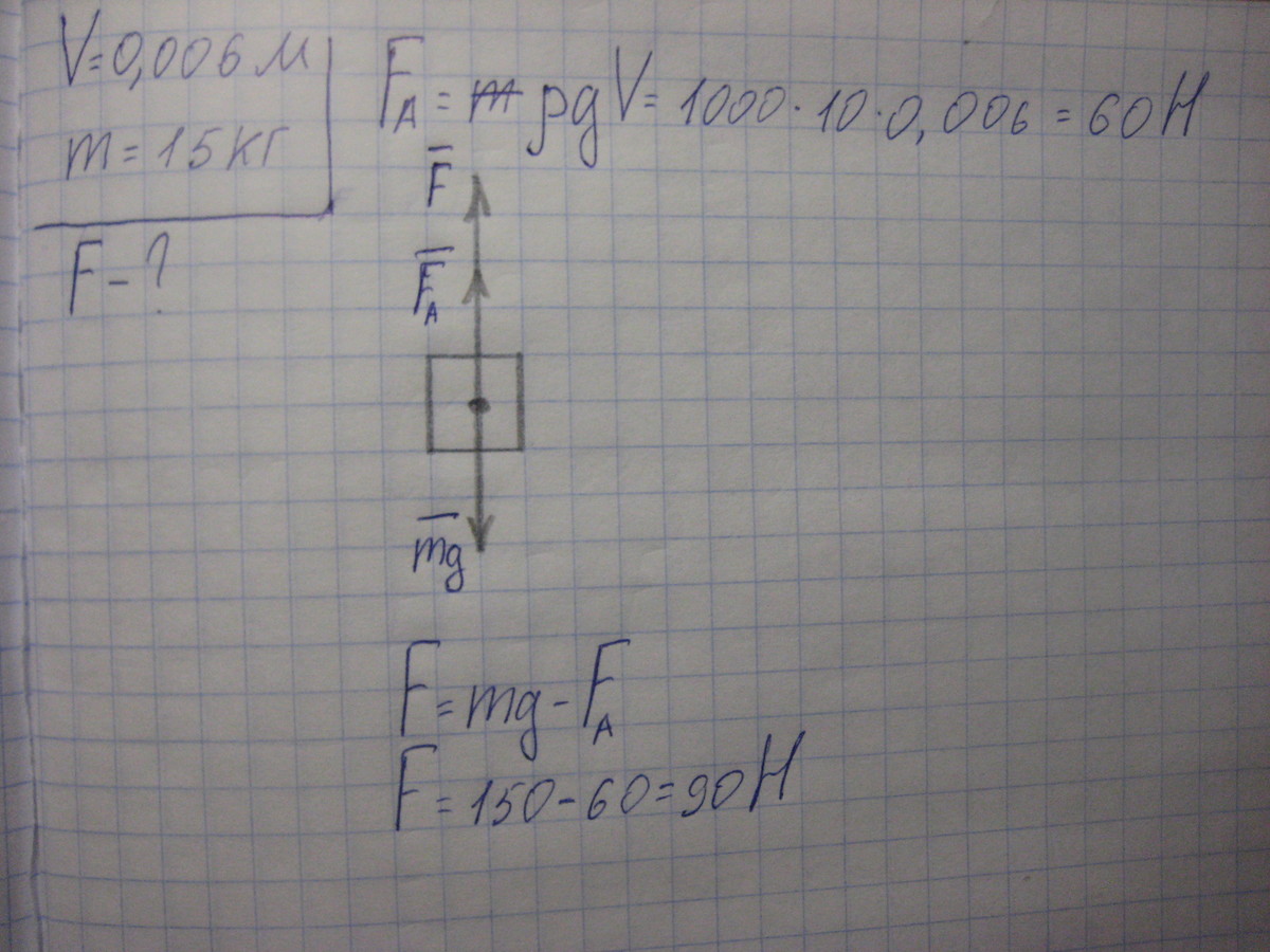 помогите пожалуйста камінь обємом 0.006м кубічних має масу 15 кг яка сила буде потрібна щоб утримати повністю занурений у воду камінь