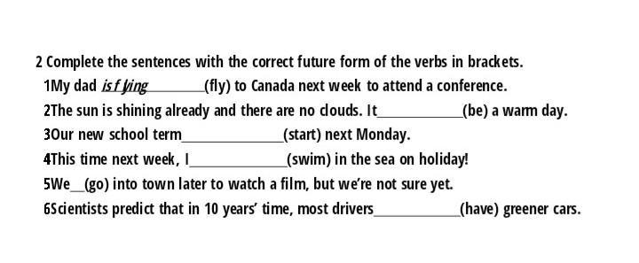 30ur new school term ____ (start) next monday. 4this time next week, i ____ (swim) in the sea on holiday! 5we ____ (go) into town later to watch a film, but we're not sure yet. 6scientists predict that in 10 years' time, most drivers ____ (have) greener cars.