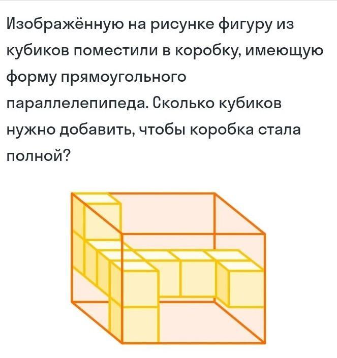 Изображённый на рисунке фигуру из кубиков поместили в коробку, имеющую форму прямоугольного параллелепипеда. Сколько кубиков нужно добавить, чтобы коробка стала полной?