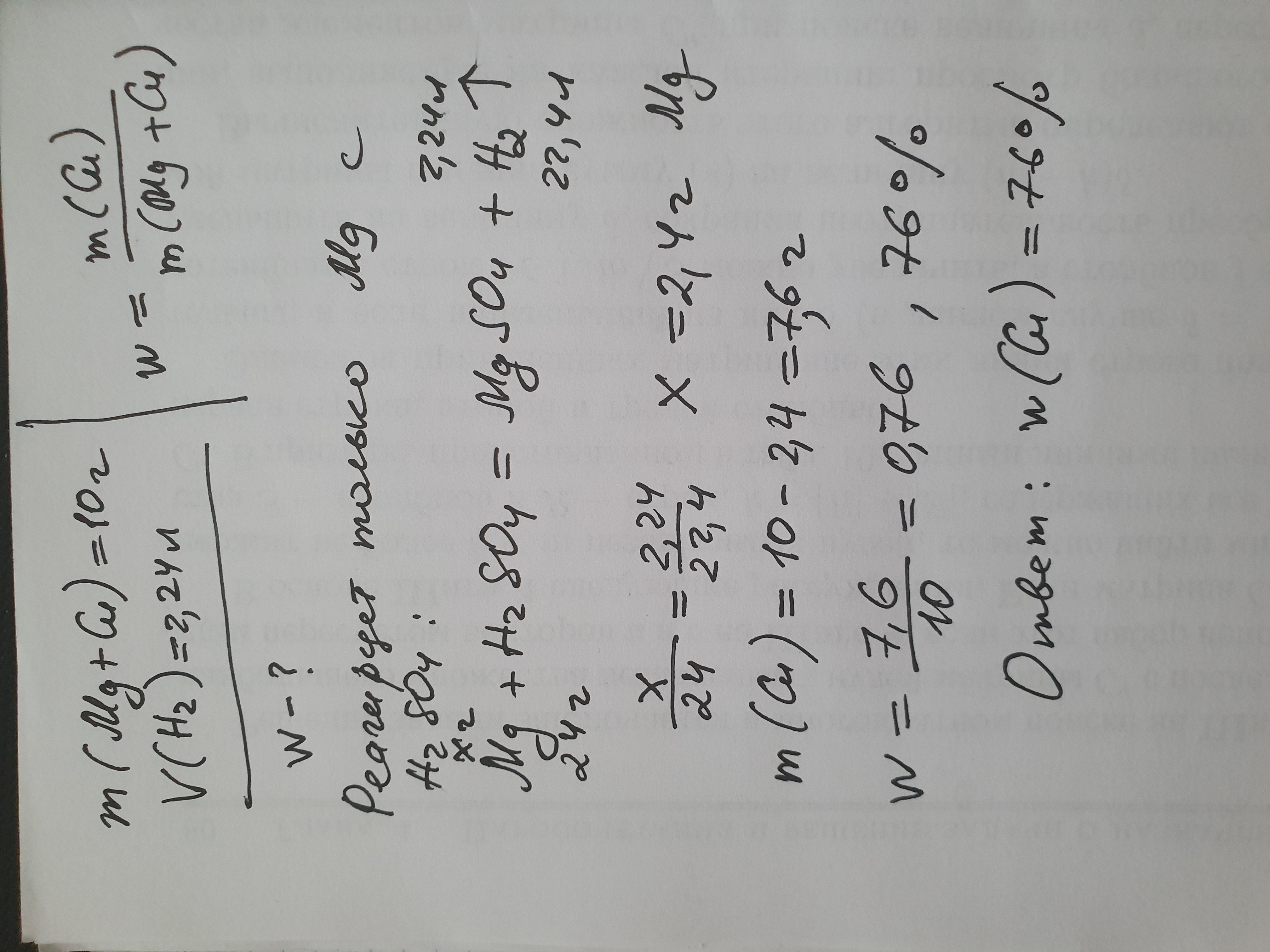Смесь магния и меди массой 10 г обработали избытком разбавленной серной кислоты. При этом выделился газ объемом 2,24 дм3 (н. у.). Определите массовую долю (%) меди в исходной смеси.