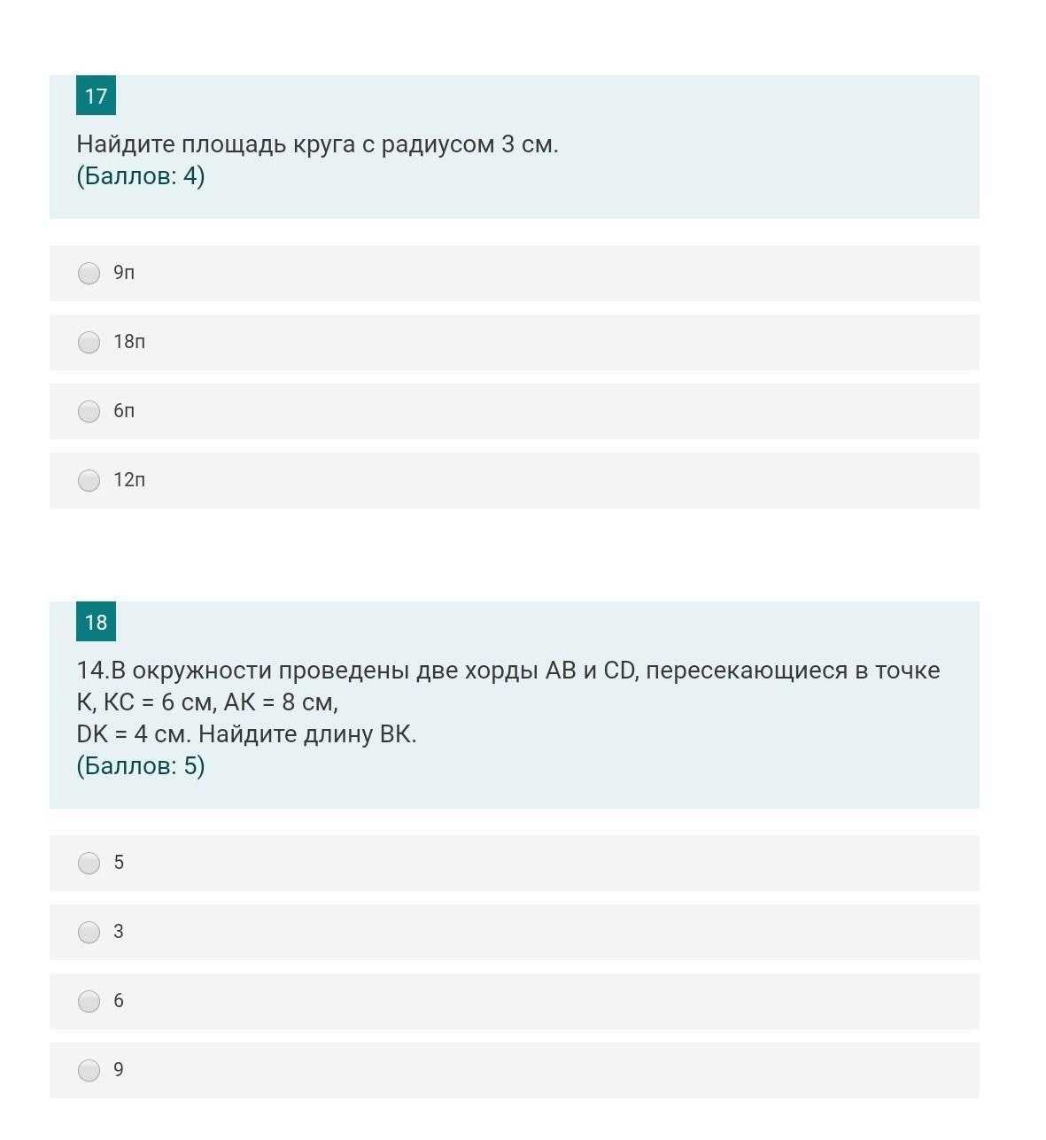 S=3.14*9 = 28.26 см квадратных