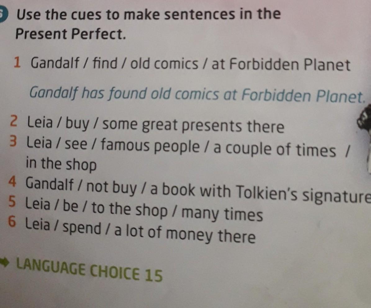 2. Leia has bought; 3. Leia has seen; 4. Gandalf hasn't bought; 5. Leia has been; 6. Leia has spent
