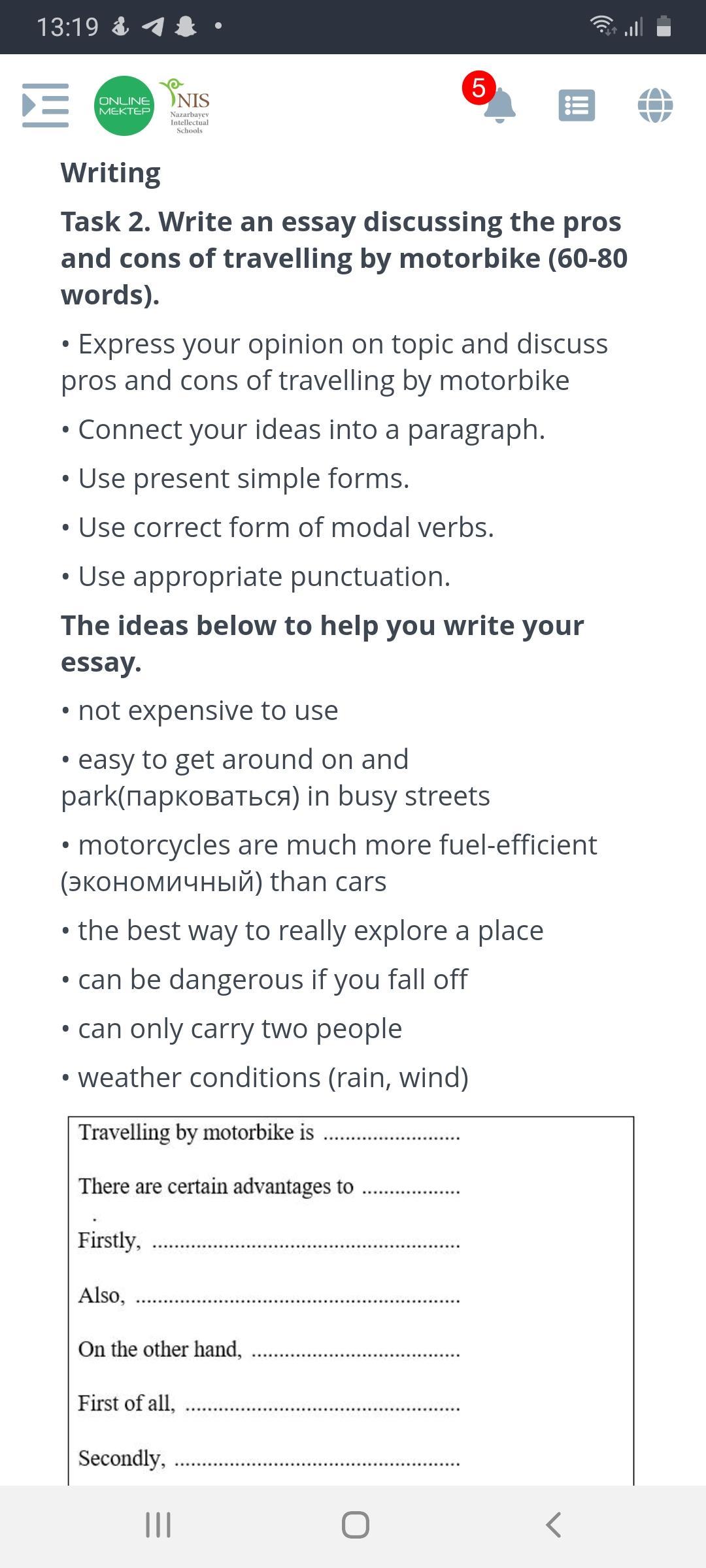Task 2. Wtite an essay discussing the pros and cons of traveling by motorbike (60-80 words)