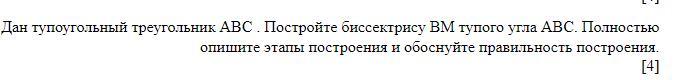 Дан тупоугольный треугольник АВС . Постройте биссектрису ВМ тупого угла АВС. Полностью опишите этапы построения и обоснуйте правильность построения
