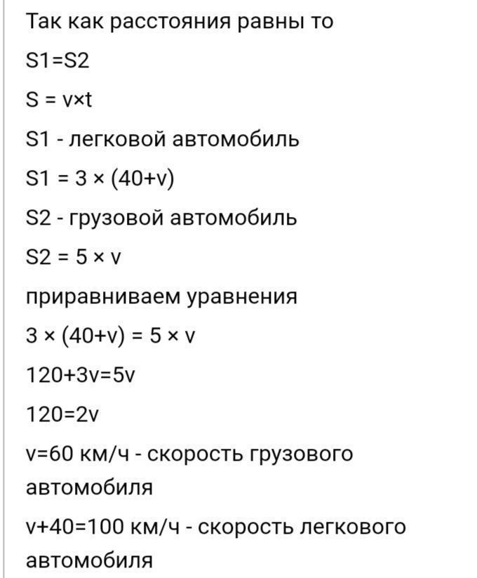 Так как расстояния равны то S1=S2 S = v×t S1 - легковой автомобиль S1 = 3 × (40+v) S2 - грузовой автомобиль S2 = 5 × v приравниваем уравнения 3 × (40+v) = 5 × v 120+3v=5v 120=2v v=60 км/ч - скорость грузового автомобиля v+40=100 км/ч - скорость легкового автомобиля