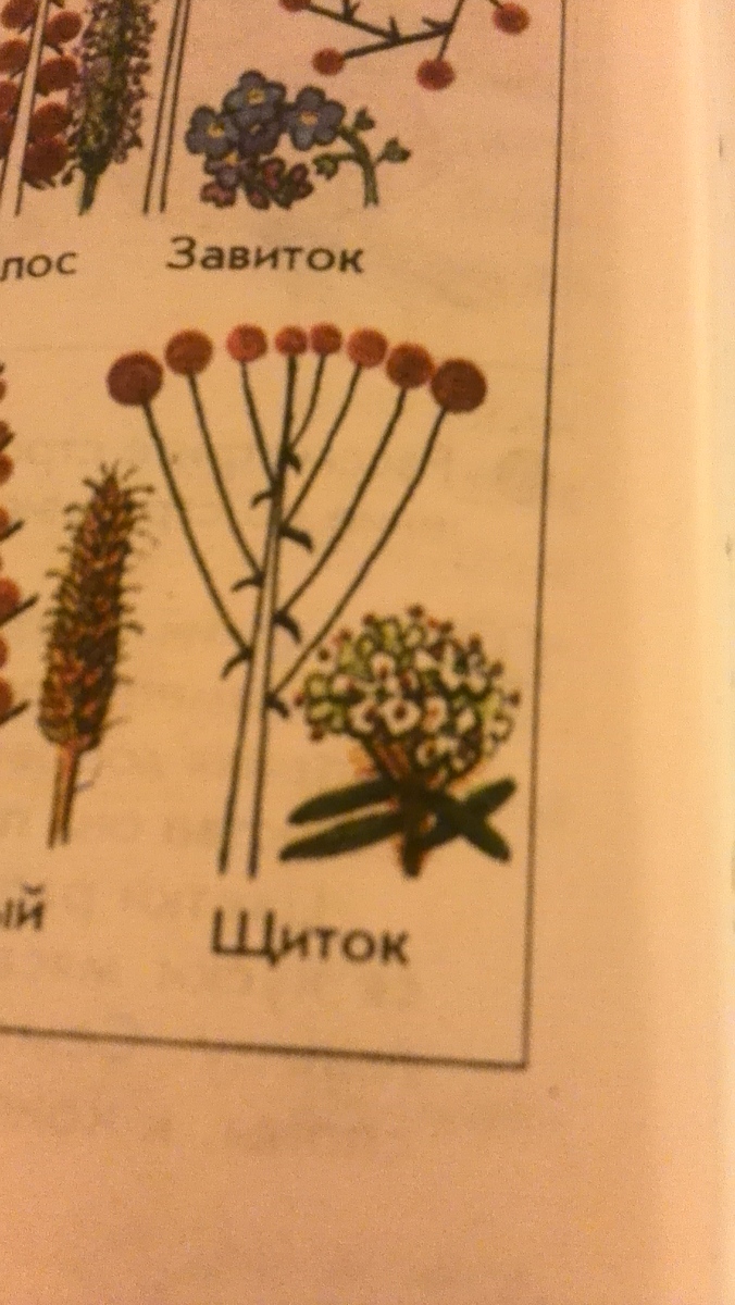 Щиток соцветие, у которого на главной цветоножке находится еще несколько цветоножек второго порядка, последовательно отходящих одна за другой, причем каждая последующая цветоножка короче предыдущей. Примеров множество: Яблоня, груша, калина, тысячелистник