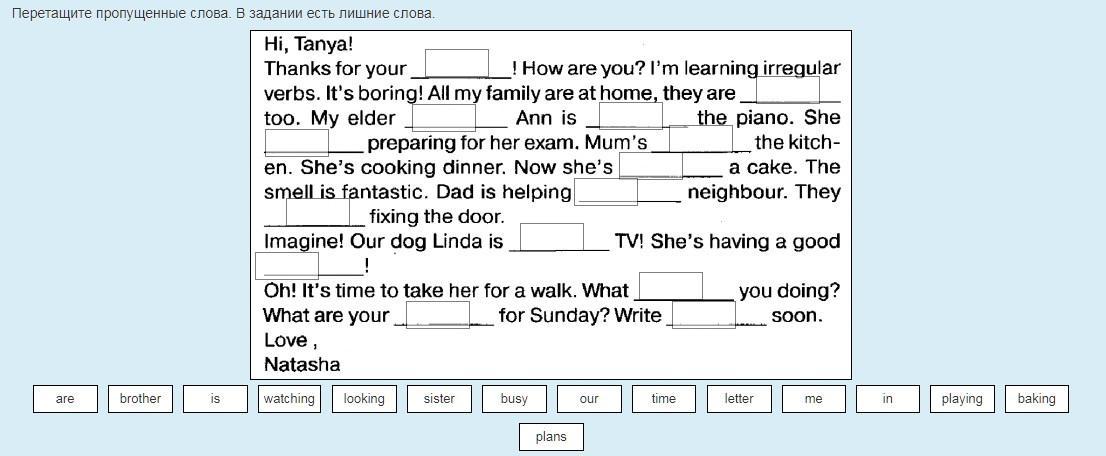 Объяснение:letter, busy, sister, playing, is, in, baking, our, are, watching, time, are, plans, me.