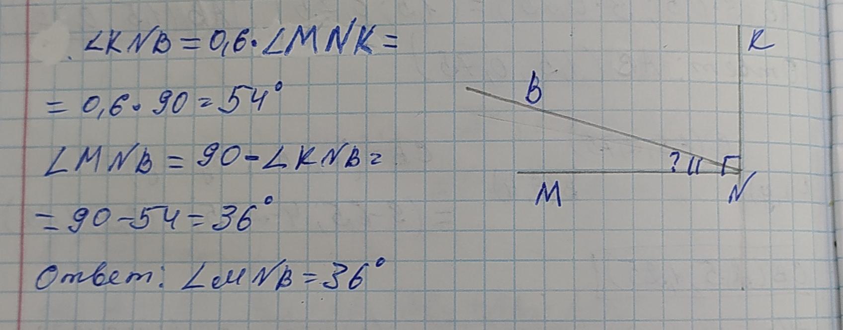 Луч NB делит прямой угол MNK на два угла. Градусная мера угла KNB составляет 0,6 части градусной меры угла MNK. Найдите градусную