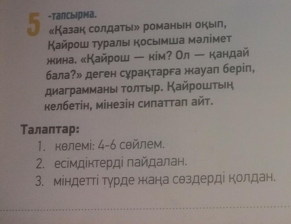 Қазақ солдаты романың басты кейіпкері Қайрош. Ол Кеңес Одағының батыры. Онын мінезі қайтпас қайсар ержүрек болған. Ол мықты шыншыл әділ жауынгер болған.