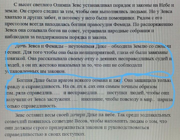 Задание 1. Прочитайте внимательно и выполните задания. Древнегреческая мифология связывала созвездие Весов с весами богини справедливости Дике. С высот светлого Олимпа Зевс устанавливал порядок и законы на Небе и земле. Он строго следил за тем, чтобы они выполнялись людьми. Но у Зевса хватало и других забот, и поэтому у него были помощники. Рядом с его престолом всегда находилась богиня правосудия Фемида. По распоряжению Зевса она созывала богов на совет, устраивала народные собрания и наблюдала за поддержанием порядка и закона. Дочь Зевса и Фемиды – неутомимая Дике – обходила Землю со своими весами. Для того чтобы она была нелицеприятной, глаза её были завязаны повязкой. Она рассказывала своему отцу о деяниях несправедливых судей и людей, а он их жестоко наказывал за то, что они не соблюдали установленных им законов. Богиня Дике была врагом всякого обмана и лжи. Она защищала только правду и справедливость. На св..их в..сах она самым точным образом изм..ряла справедлив….. и несправедлив….. поступки людей, чтобы они получили от Зевса заслуженн….. наказание, чтобы повсюду в мир.. царила только справедливость. Зевс оставил весы своей дочери Дике на небе. Так среди зодиакальных созвездий появилось созвездие Весов, чтобы напомнить людям о том, что они должны строго придерживаться законов и руководствоваться справедливостью в своих поступках. 1. Придумайте тексту заголовок, отражающий тему. 2. Определите тип текста. 3. Сформулируйте и запишите основную мысль текста. 4. Выпишите предложение, в котором есть примеры употребления НЕ с прилагательными и глаголами. 5. Выпишите предложение с пропущенными буками, вставьте правильно гласные в корнях слов и окончаниях существительных и прилагательных.