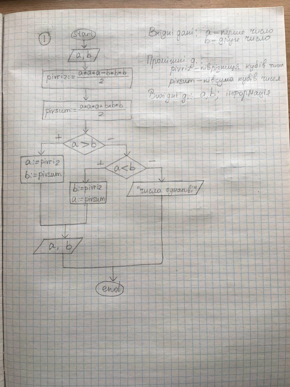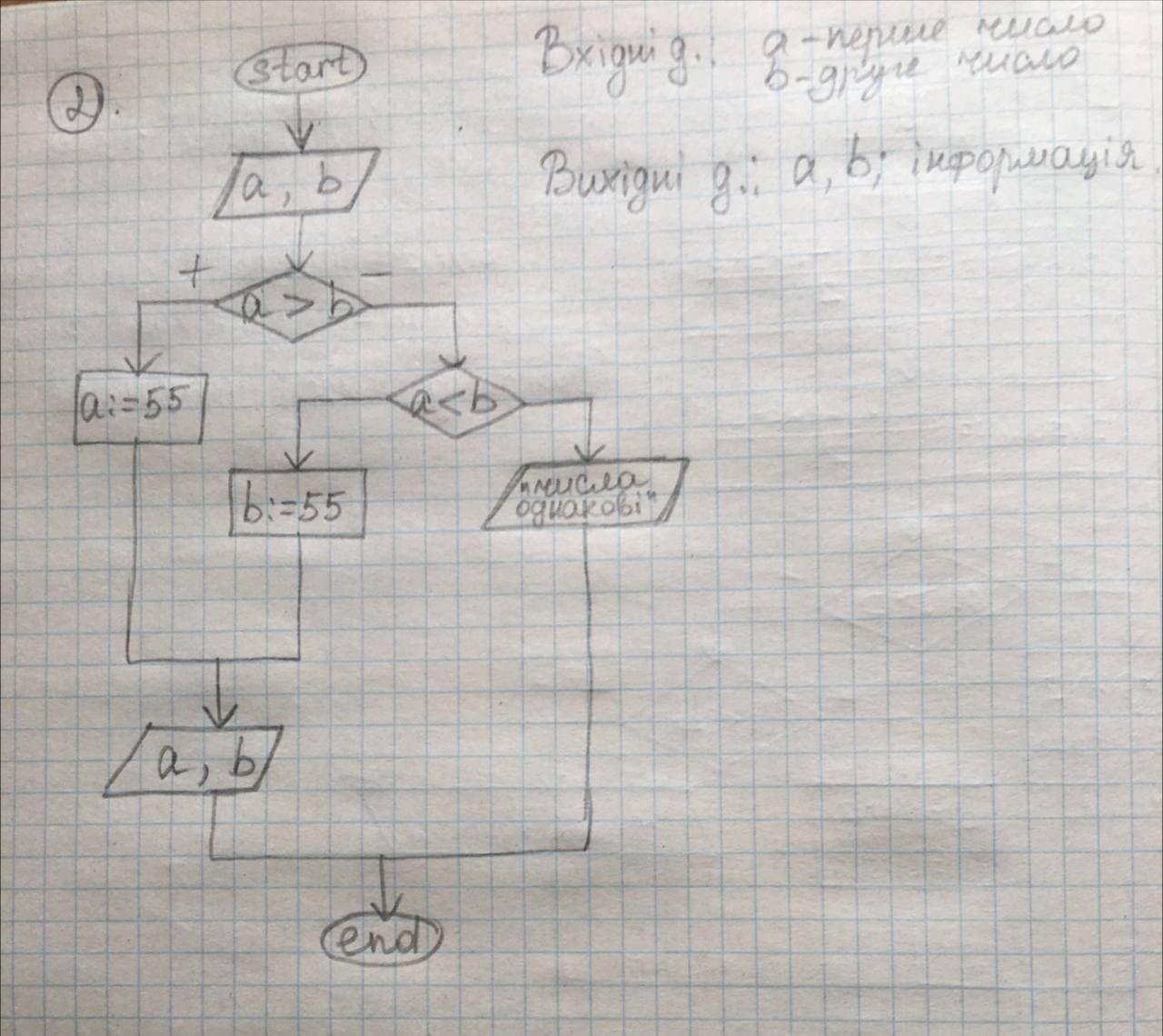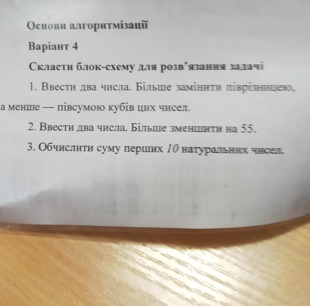 Скласти блок-схему для розв'язання задачі 1. Ввести два числа. Більше замінити твризницев а менше - півсумою кубів цих чисел. 2. Ввести два числа. Більше зменшити на 55. 3. Обчислити суму перших 10 нагуральных чисел