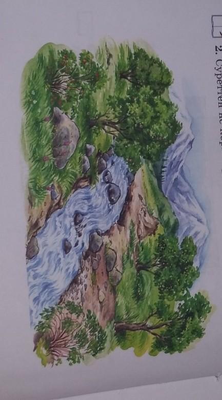 суретте нелер бейнеленген? таудан су қалай ағады? таудың етегінде қандай жеміс ағаштары өскен? жемістің дәмі қандай? таудан аққан бұлақта не кездеседі? оның қыймыл ерекшелігі туралы не айтар едің?