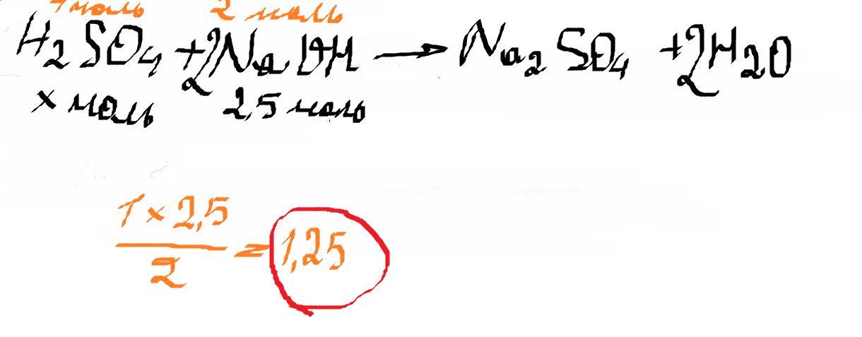 По уравнению реакции видно,что на 2 части щелочи тратиться 1 часть кислоты. Соответственно, нужно количество потраченной щелочи (натрий гидроксида) поделить на 2 и получаем 1,25 моль.