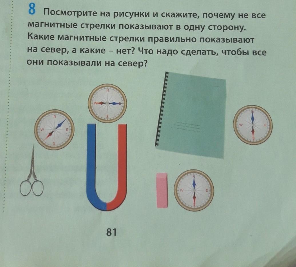 Потому что возле некоторых стрелок лежат предметы, сбивающие показания (магнит и металлические ножницы). Правильно на Север указывают стрелки возле тетради и ластика (или что это, розовый брусок). Чтобы остальные стрелки также показали правильно, нужно убрать от них магнит и ножницы.