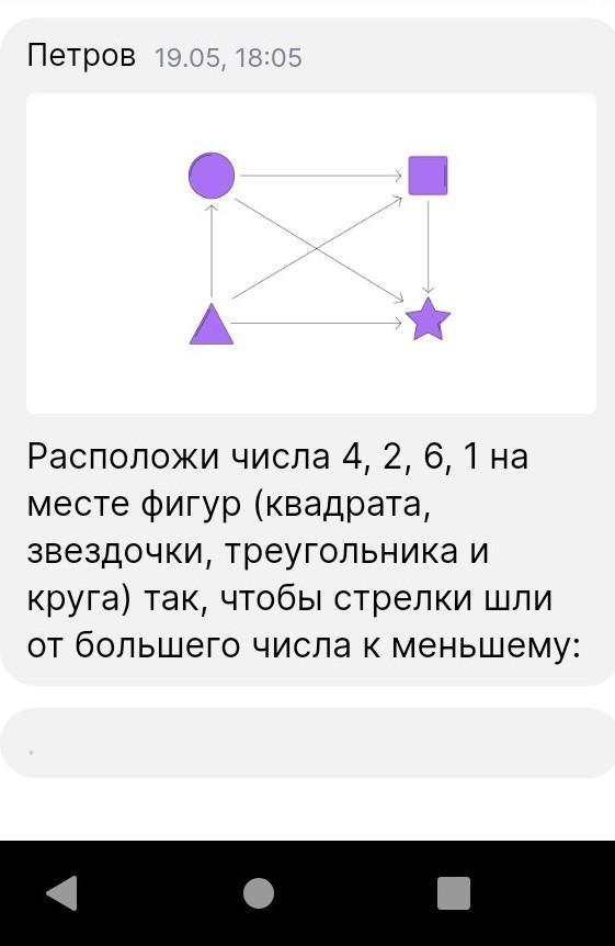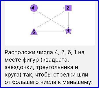 Расположи числа 4, 2, 6, 1 на месте фигур (квадрата, звездочки, треугольника и круга) так, чтобы стрелки шли от большего числа к меньшему