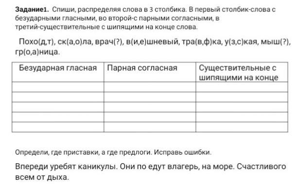 Задание1. Спиши, распределяя слова в 3 столбика. В первый столбик-слова с безударными гласными, во второй-с парными согласными, в третий-существительные с шипящими на конце слова.