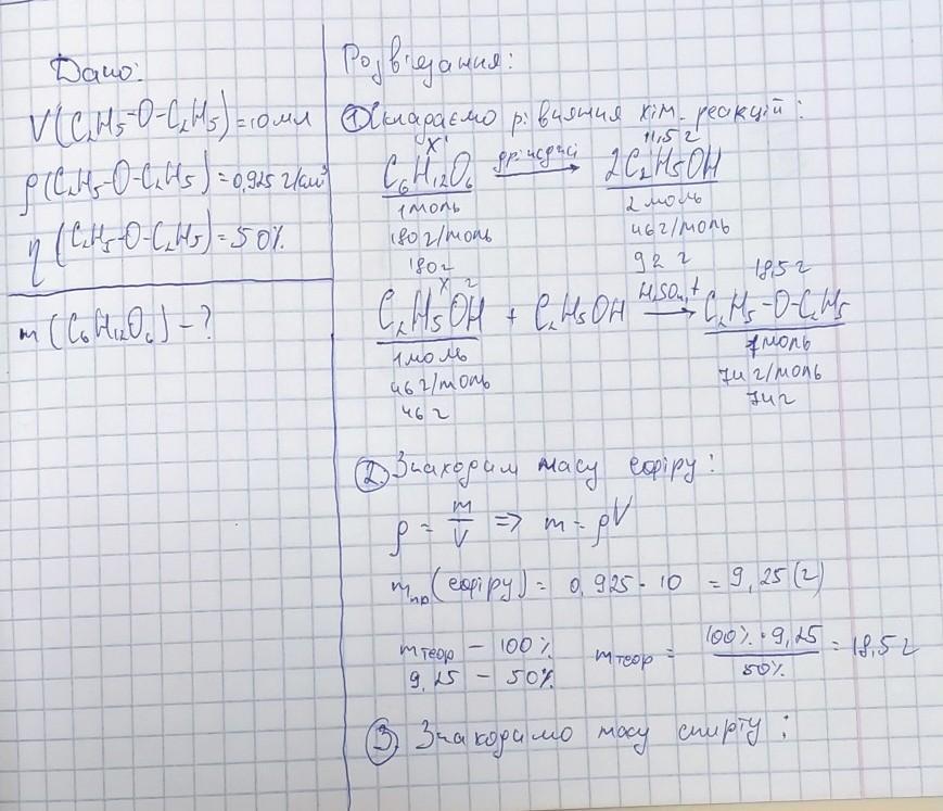 Яка маса глюкози необхідна для добування з неї етилового спирту бродінням, якщо відомо, що при нагріванні добутого спирту з концентрованою сульфатною кислотою утворюється 10 мл діетилового ефіру p=0.925 г/см3 з виходом 50% від теоретичного можливого