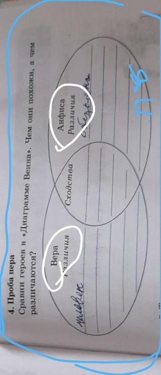 4.проба пера Сравни героев в "диаграмме Венна" Чем они похожи и чем различаются| | |Вера различия| |< сходства>| | Анфиса различия||только пж быстро