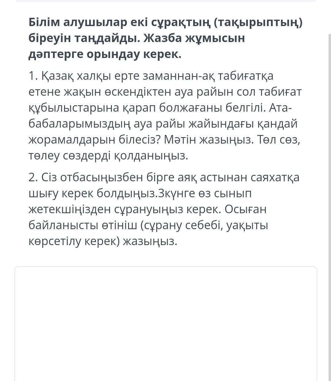 Білім алушылар екі сұрақтың (тақырыптың) бiреуiн таңдайды. Жазба жұмысын дәптерге орындау керек.