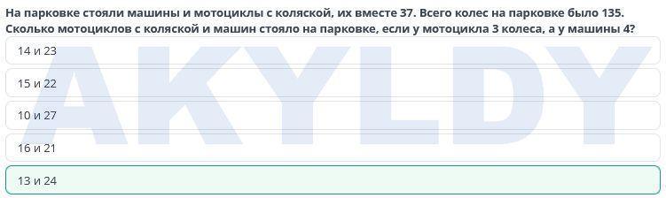 ответ: 24 машины и 13 мотоциклов с коляской стояло на стоянке.