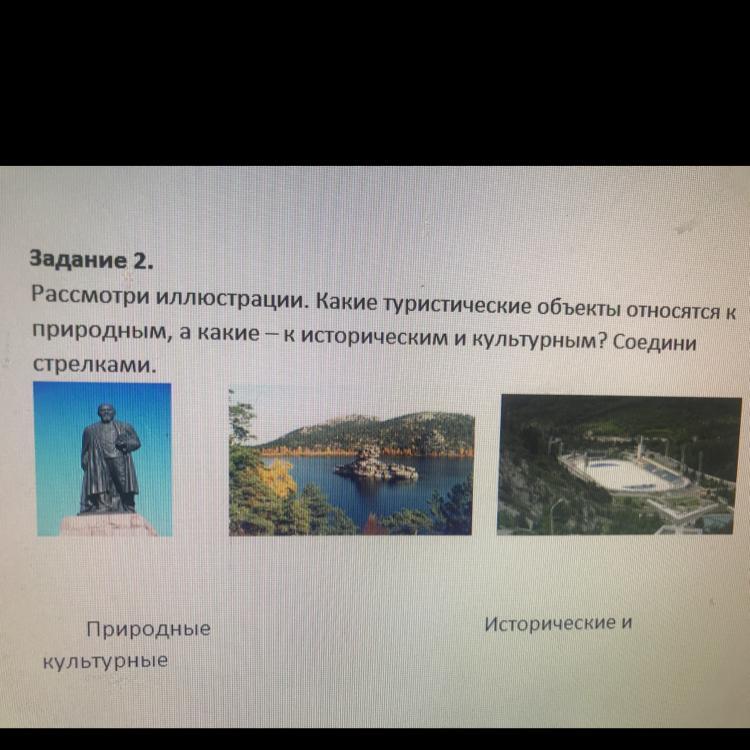 Рассмотри иллюстрации. Какие туристические объекты относятся к