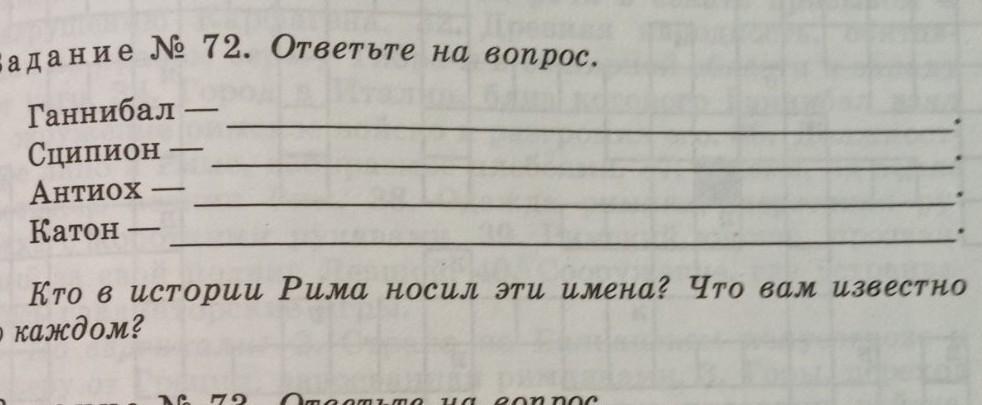 Ганнибал) — имя финикийского происхождения, означающее в переводе «дар Баала» Сципион --- римский военачальник и политический деятель, консул 205 и 194 годов до н. э. Начал военную карьеру в 218 году до н. э. во время Второй Пунической войны. По данным некоторых источников, был одним из командиров тех солдат, которые смогли уцелеть при Каннах в 216 году. Анитиох--- имя греческого происхождения, антропоним, топоним. Катон---ветвь древнеримского рода Порциев. Марк Порций Катон Старший римский писатель, основоположник римской литературной прозы и государственный деятель.