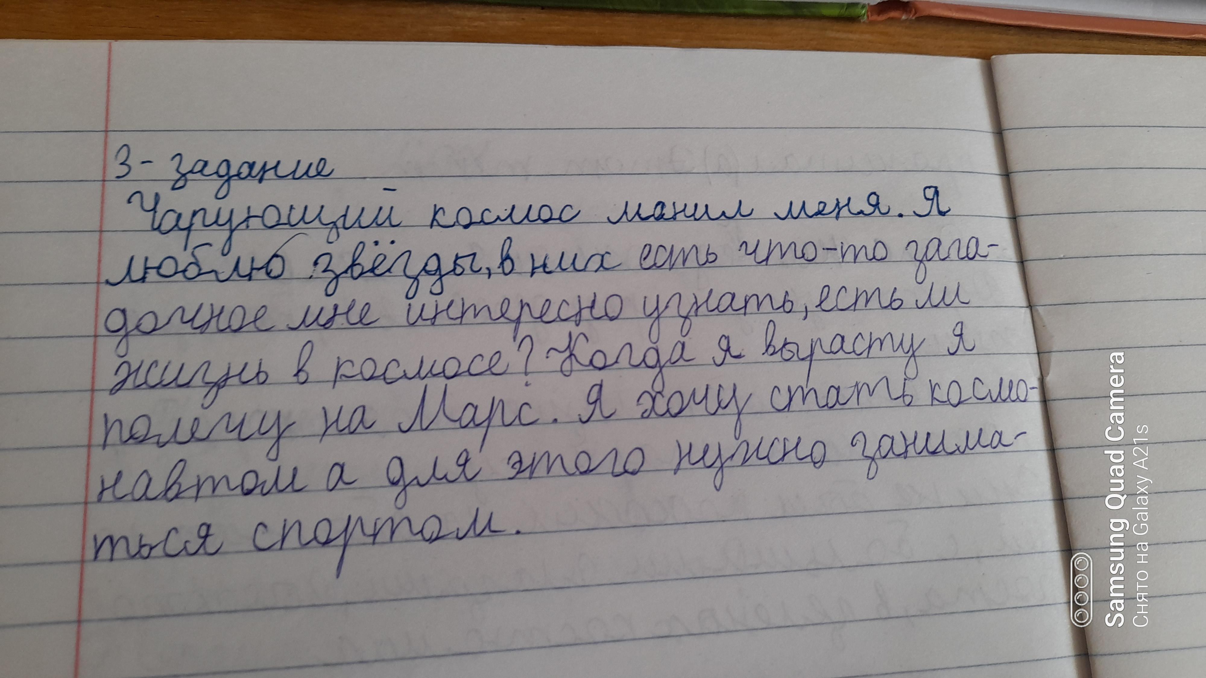 Чарующий космос манил меня. Я люблю звезды. В них есть что-то загадочное. Мне интересно узнать, есть ли жизнь в космосе. Когда я вырасту, я полечу на Марс. Я хочу стать космонавтом, а для этого мне нужно заниматься спортом.