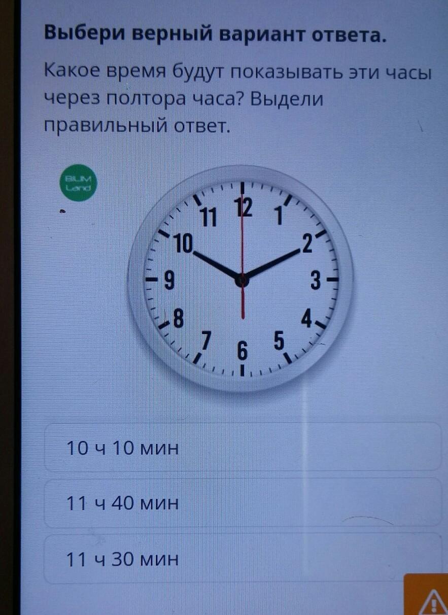 Выбери верный вариант ответа какое время будут показывать эти часы через полтора часа Выбери правильный ответ 10:10, 11:40, 11:30