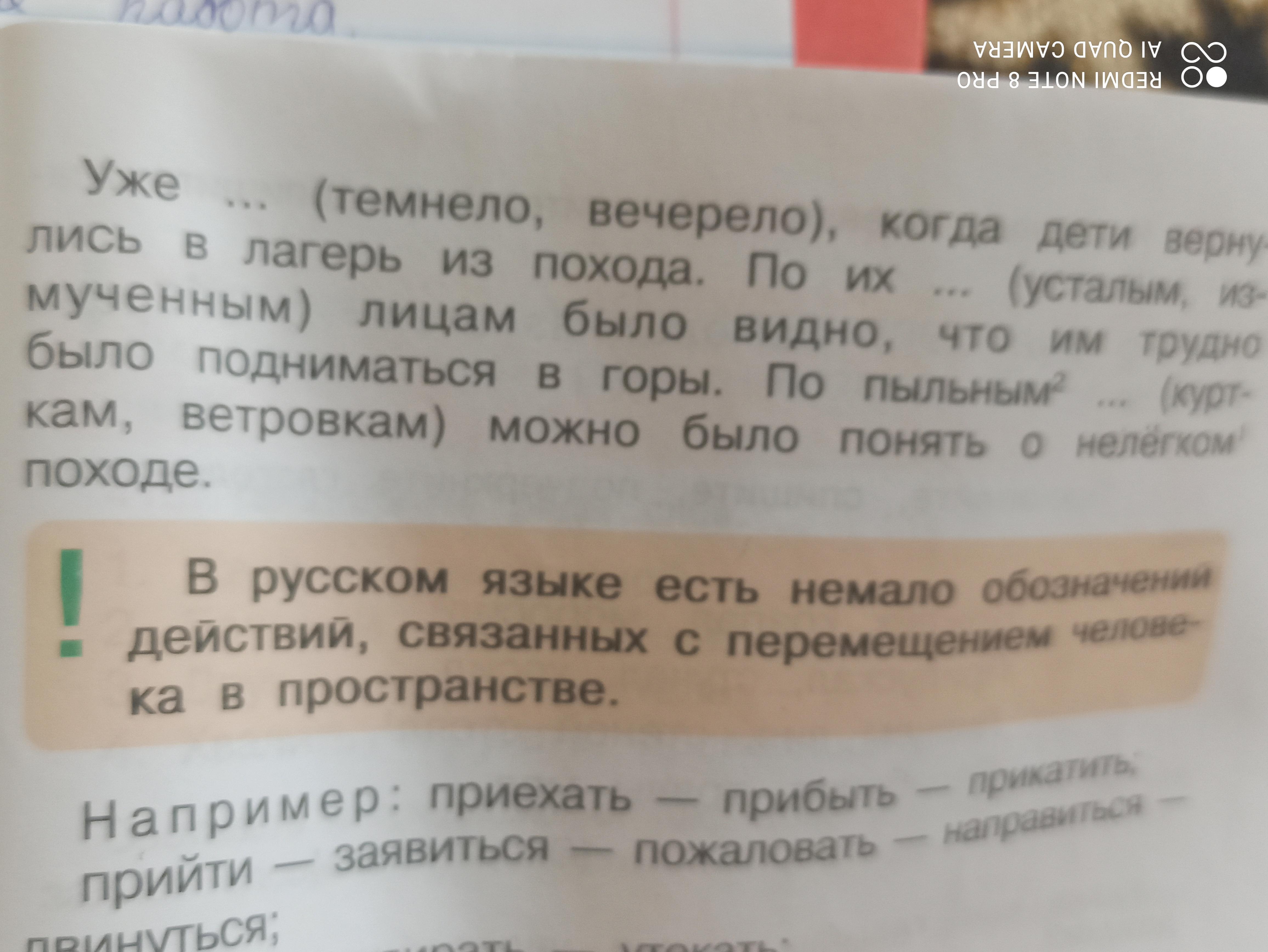 Уже !темнело! , когда дети вернулись в лагерь из похода. По их !усталым! лицам было видно,что им трудно было подниматься в горы .По пыльным !курткам! можно было понять о нелёгком походе.