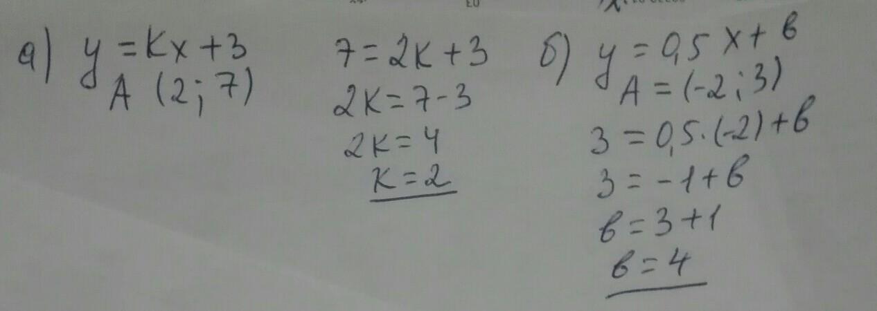 a)при каком значении k прямая у=kx+3 проходит через точку A(2;7)?