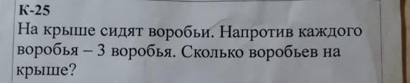На крыше сидят воробьи. Напротив каждого воробья - 3 воробья. Сколько воробьев на крыше?
