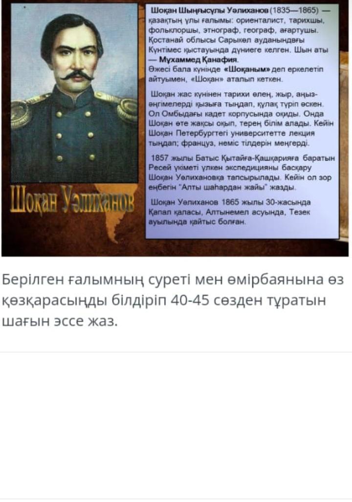 Берілген ғалымның суреті мен өмірбаянына өз қөзқарасыңды білдіріп 40-45 сөзден тұратын шағын эссе жаз .