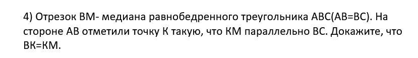 Отрезок ВМ- медиана равнобедренного треугольника АВС(АВ=ВС). На стороне АВ отметили точку К такую, что КМ параллельно ВС. Докажите, что ВК=КМ.