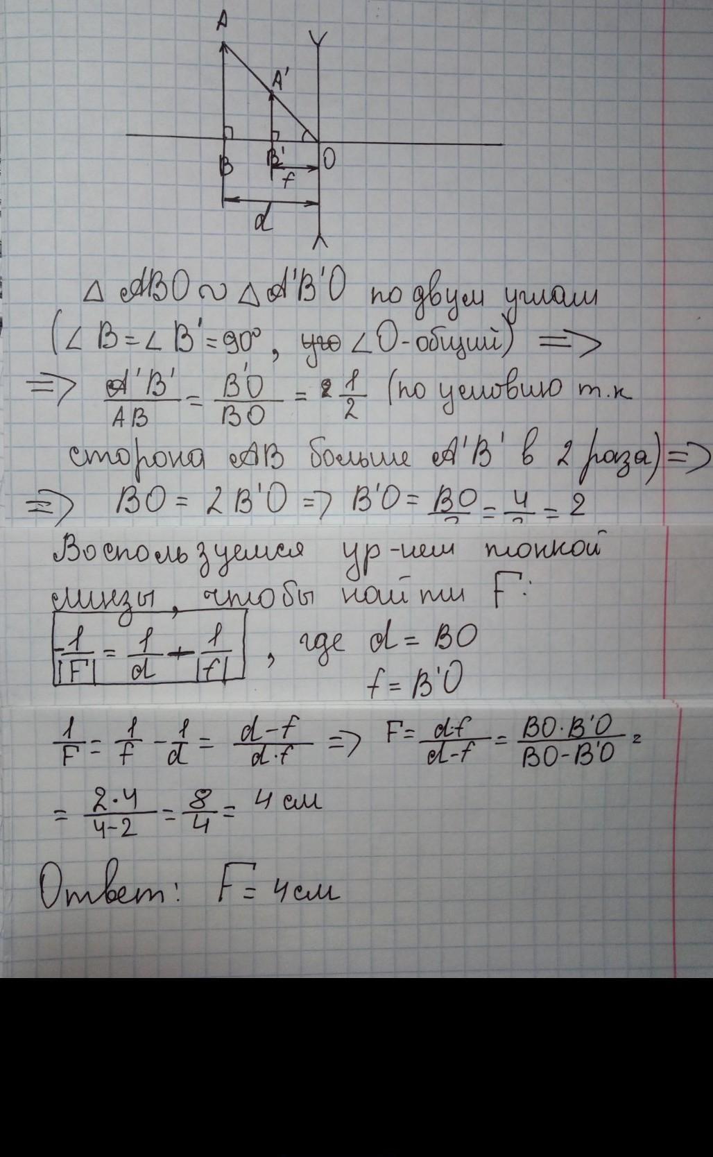 С помощью линзы получили мнимое уменьшенное в 2 раза по сравнению с предметом изображение, когда предмет располагался на расстоянии 4 см от линзы. Чему равно фокусное расстояние линзы в сантиметрах ?