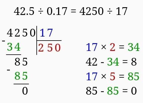 Уравниваем количество знаков после запятой,добавляя ноль в 42,5 и убираем после этого запятые,и просто делим