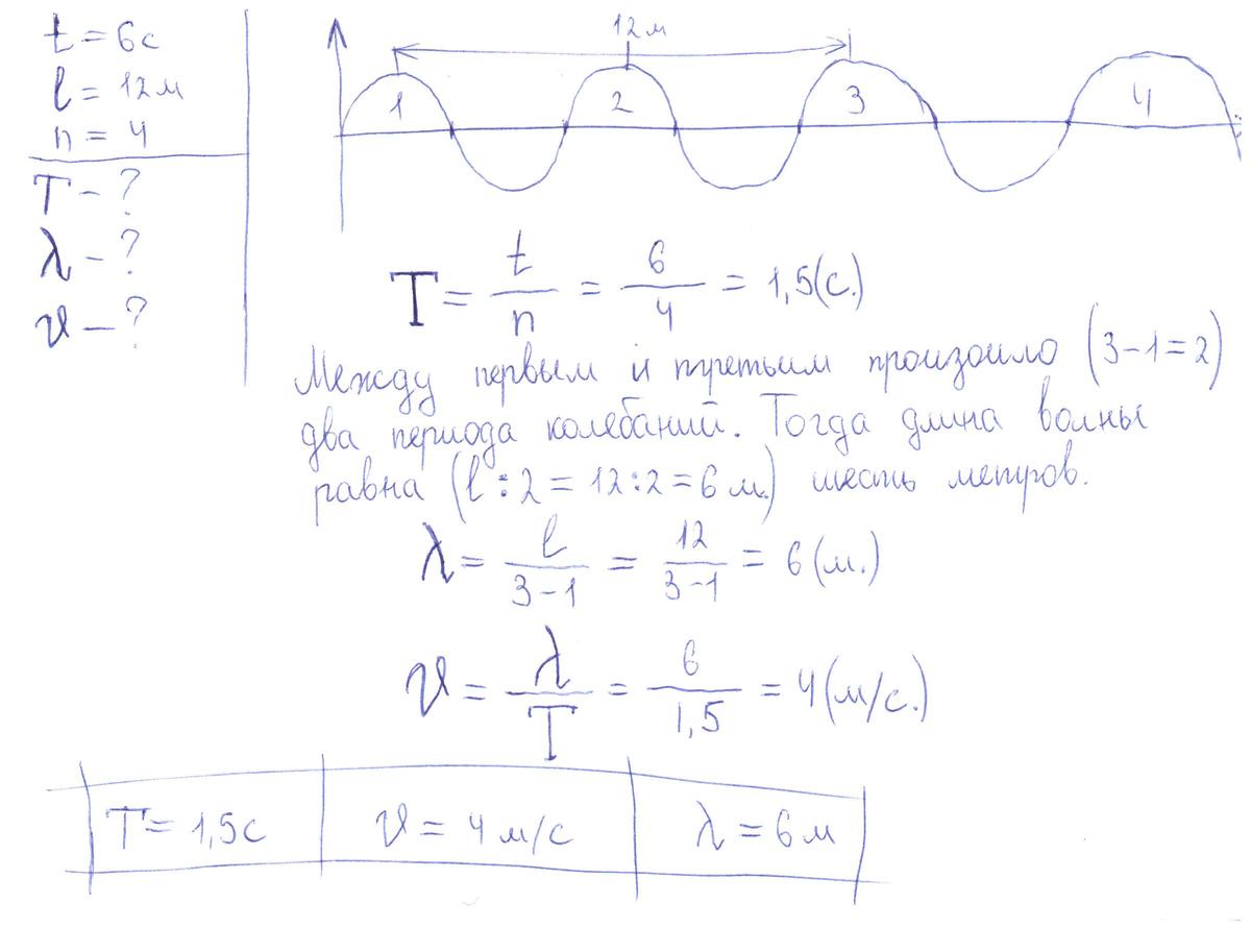 Мимо неподвижного наблюдателя, стоящего на берегу озера, за 6 с прошло 4 гребня волны. Расстояние между первым и третьим гребнями равно 12 м. Определить период колебания частиц волны, скорость распространения и длину волны.