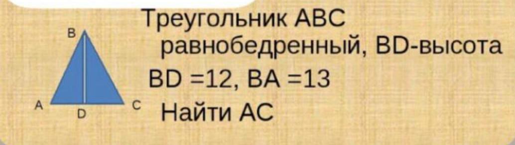 за т. пифагора АD = 5 cм, поскольку треугольник равнобедренный BD это медиана и биссектриса, АС = 5 + 5 = 10 см