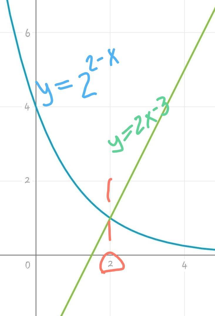 При х < 2 график функции 2^(2-х) расположен выше графика функции 2х-3